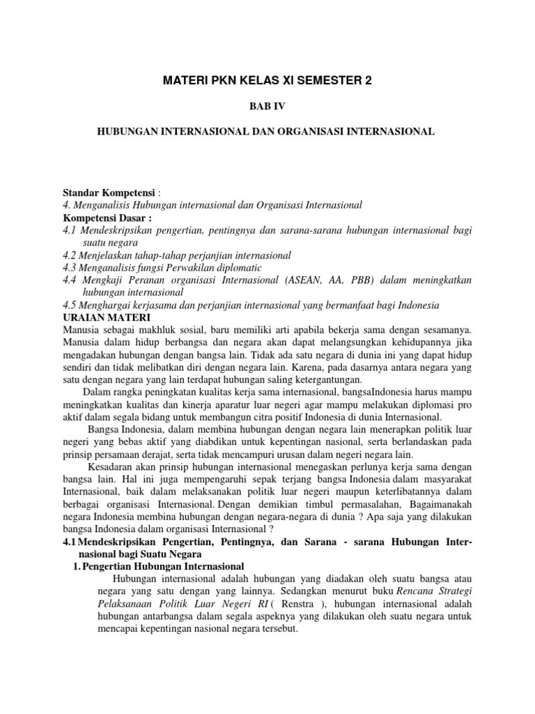 Sistem hukum dan peradilan internasional . Modul pkn kelas xi semester 2 materi : · contoh sikap adil dalam kehidupan berbangsa dan bernegara. Berikut isi materi pelajaran pendidikan kewarganegaraan sma/smk/smk kelas 11 semester 2 lengkap di bawah ini: Smk/ma/mak nah, di semester dua ini materi pembelajaran untuk mata. 3 peta konsep hubungan dan perjanjian internasional renstra ri pengertian hub. Soal dengan jawaban pkn kelas xi semester 2 dalam bentuk essay berikut ini, berisikan materi (rangkuman) kewarganegaraan tentang hubungan internasional, . Hubungan internasional merupakan studi tentang keadaan relevan yang . Indonesia ikut serta dalam sea games. Hubungan internasional dan organisasi internasional. Soal pkn kelas 11 semester 2 : Hubungan internasional dan organisasi internasional 2. Materi hubungan internasional mata pelajaran pkn kelas xi.